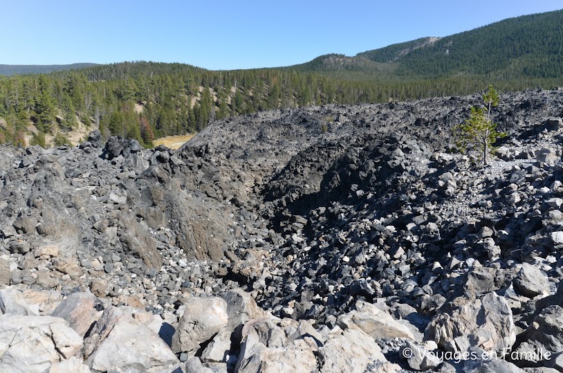 L'arrivée au sommet est magique, avec une vue sur toute la coulée d'obsidienne, le lac et au loin les monts de la chaine des Cascades.