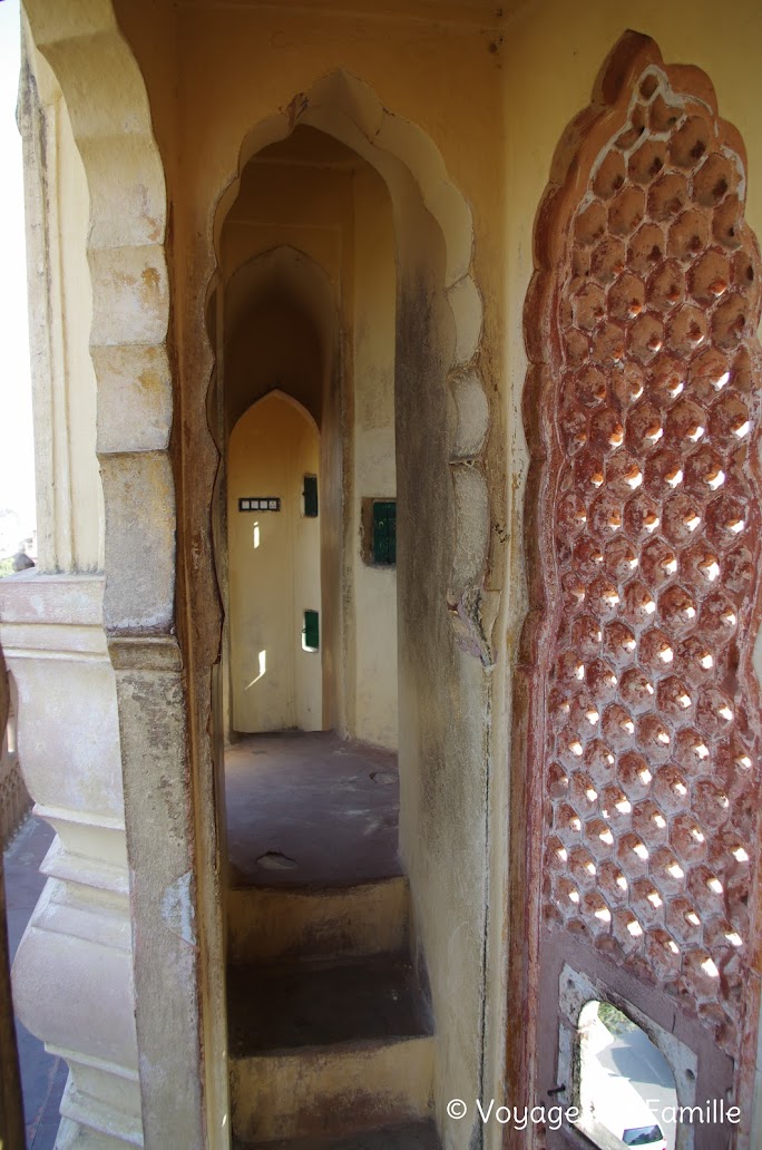 Enfin nous arrivons au Palais de Man Singh I. C'est la partie la plus ancienne du Fort. Au centre, un petit pavillon autrefois muni de rideaux, était le boudoir des Maharanis. Tout autour le maharajah avait fait construire 12 appartements our ses 12 épouses.