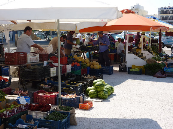 Ce sont les paysans de Komi et Kalloni qui vendent leurs produits locaux : melons, pastèques, tomates fraiches ou séchées, courgettes, câpres... petit marché très sympa.